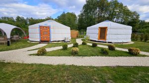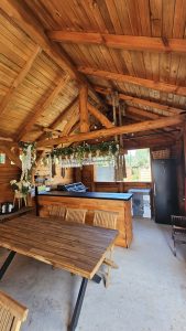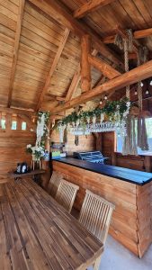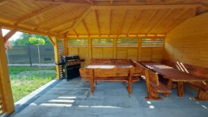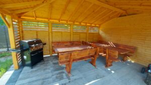 Tutaj znajdziecie stoliki i ławki do biesiadowania. Dla naszych Gości przygotowaliśmy również ruszt regulowany, żeliwny kociołek, kije do kiełbasek i drewno na opał, więc o nic nie musicie się martwić.